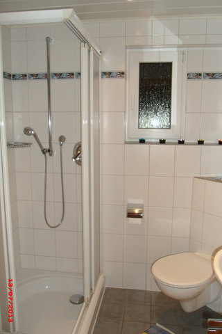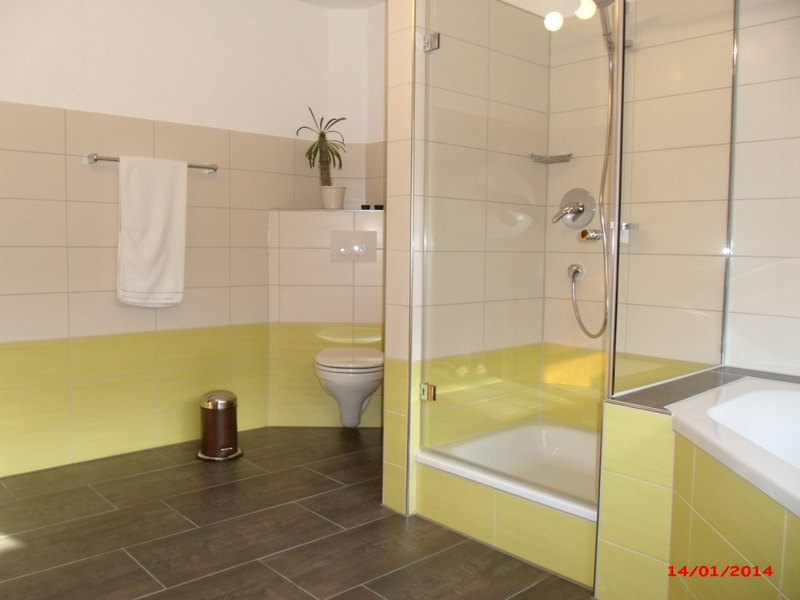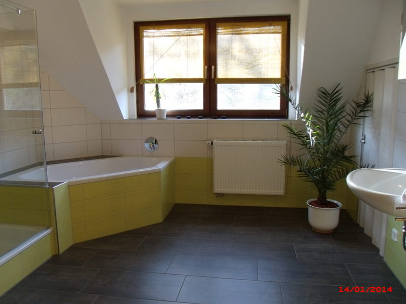 im Erdgeschoss Bad mit Dusche und WC, Handtuchwärmer, Spiegelschrank, Fön, im Obergeschoss großes Badezimmer mit Badewanne, Dusche, WC, Handtuchwärmer und Spiegelschrank | |