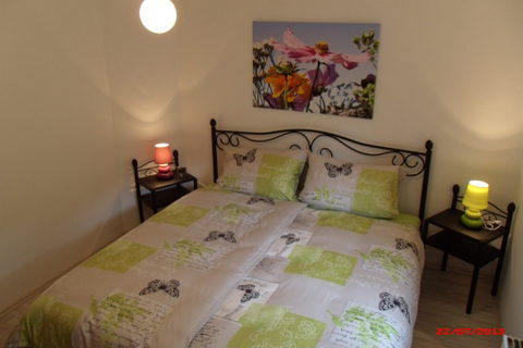 Schlafzimmer im Erdgeschoss mit Doppelbett (1,80 m x 2,00 m, Fußende offen), hochwertige Matratzen | |