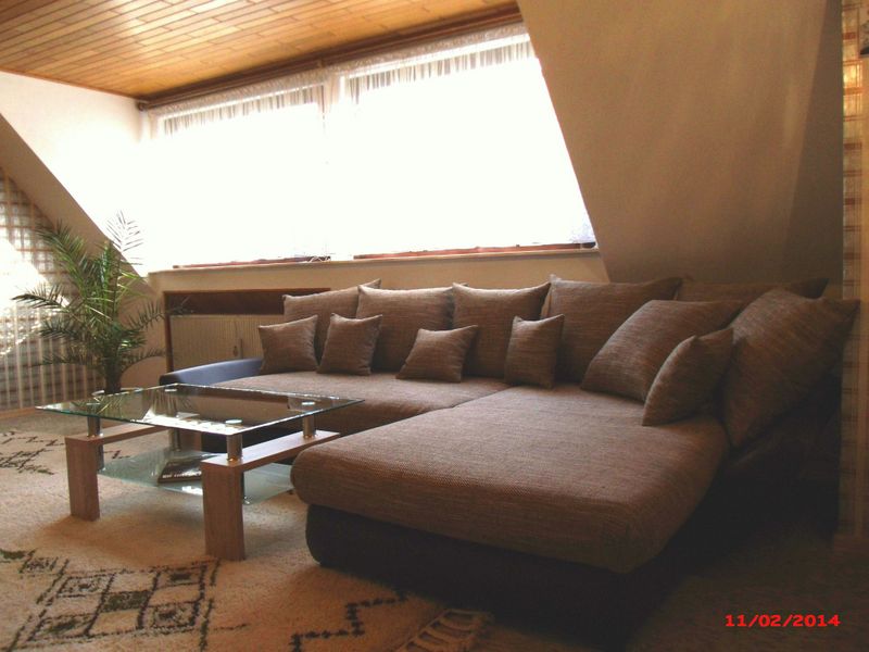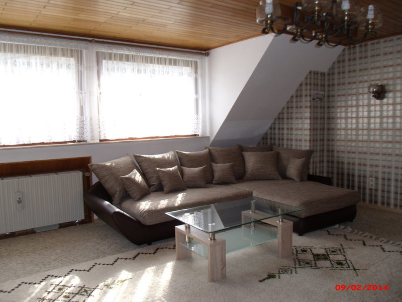 Wohnzimmer im Obergeschoss mit SAT-TV, Stereo-Anlage, CD-Player, DVD-Player, WLAN, Literatur über die Eifel sowie Unterhaltungsliteratur. | |