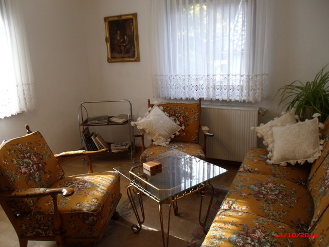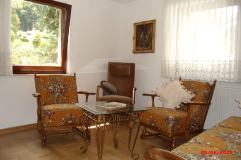 Wohnzimmer im Erdgeschoss mit SAT-TV, Radio, Literatur über die Eifel sowie Unterhaltungsliteratur. | |
